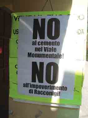 Intanto in città sono apparsi dei manifesti che recitano a caratteri cubitali: “NO al cemento nel Viale Monumentale! NO all’impoverimento di Racconigi!”.