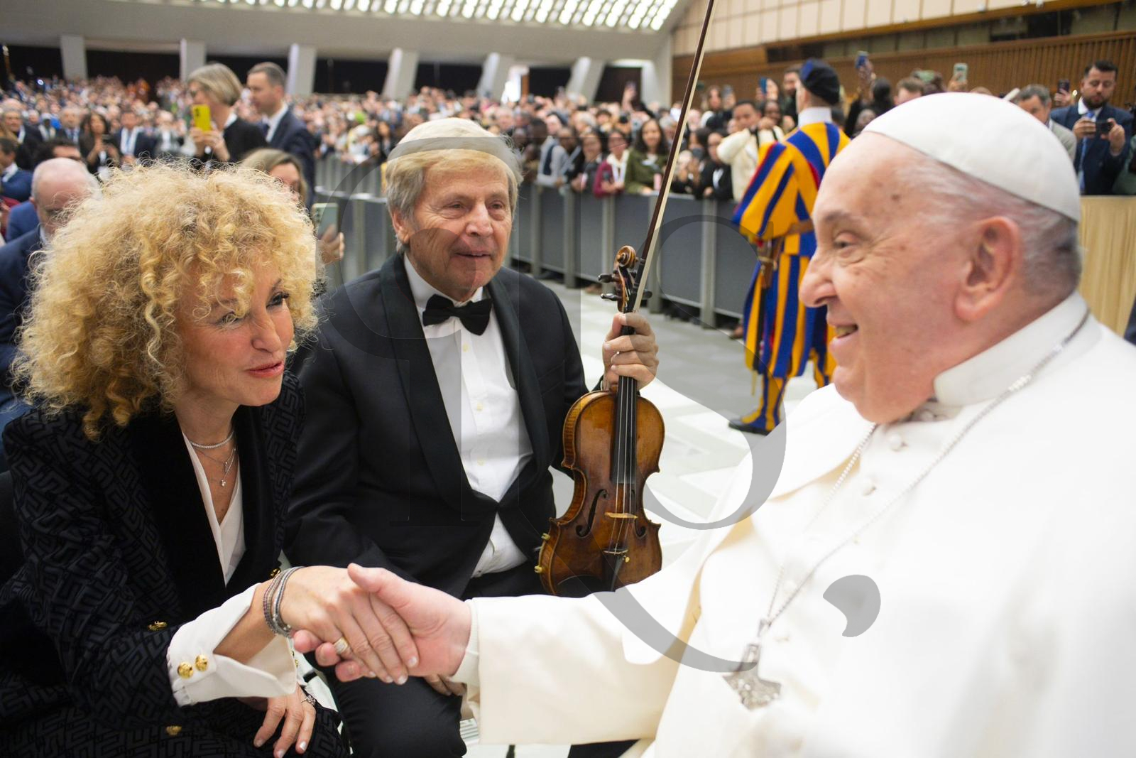 Successivamente, c’è stata l’udienza. Il violinista e il Santo Padre hanno parlato brevemente di alcuni dischi che Ughi gli aveva mandato l’anno prima e della lettera di risposta che, tramite le Guardie Svizzere, era arrivata ad Uto. Il Papa ha apprezzato in particolare la sua musica, che unisce arte, cultura e spiritualità. Per lui e per Natascia, una corona del rosario benedetta.