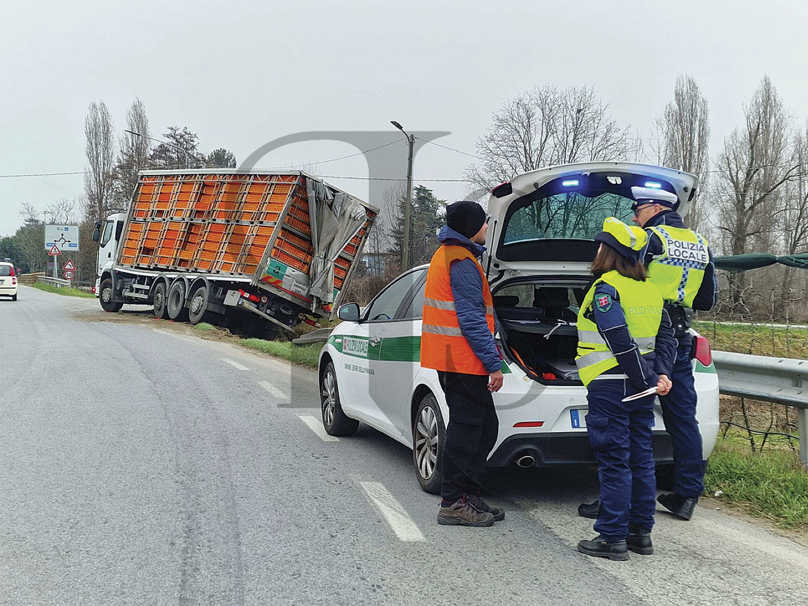 Incidente stradale domenica 9 marzo, poco prima delle ore 16, sulla provinciale 662 all’intersezione con via Sanità, vicino al “ponte della piscina”. È rimasto coinvolto un mezzo pesante carico di polli vivi, uscito di strada per cause e con dinamiche ancora al vaglio della Polizia Locale intervenuta sul posto. Il camion è finito contro il guard-rail della strada poco prima della piscina comunale: il rimorchio è rimasto in bilico sulla scarpata, con illeso il conducente.