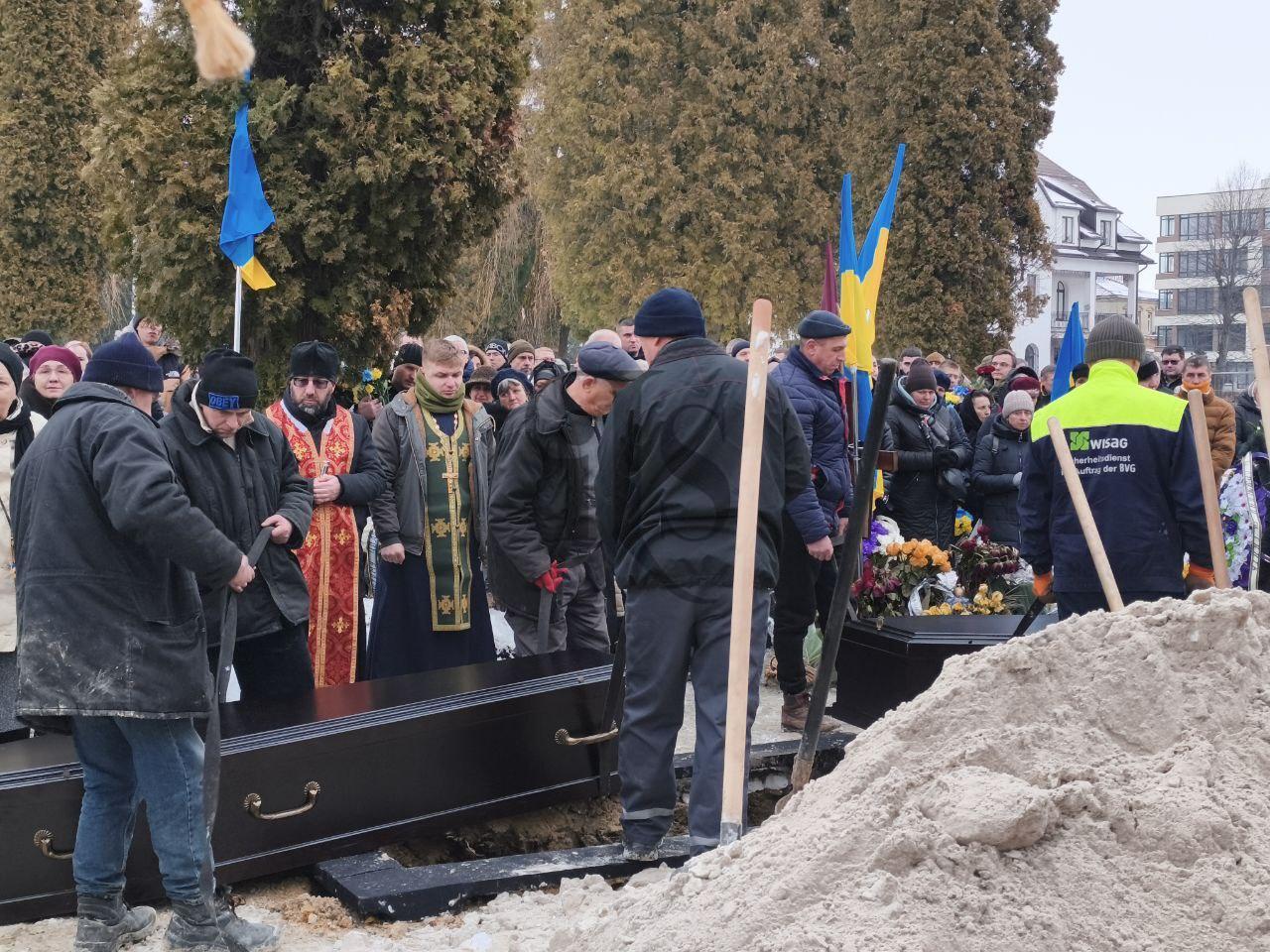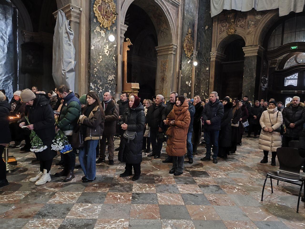 Le persone entrano e in fila indiana si dirigono dalle due bare e le toccano per poi sfilare nelle navate centrali e prendere posto in tutto lo spazio della chiesa. Il prete inizia parlando della gloria dell' Ucraina, ricordando gli eroi che muoiono ogni giorno, e prosegue raccontando come e dove sono morti i due uomini. La gente è racchiusa nel silenzio, si sentono solo i pianti delle donne e si vedono le lacrime di pochi uomini rigare i volti.